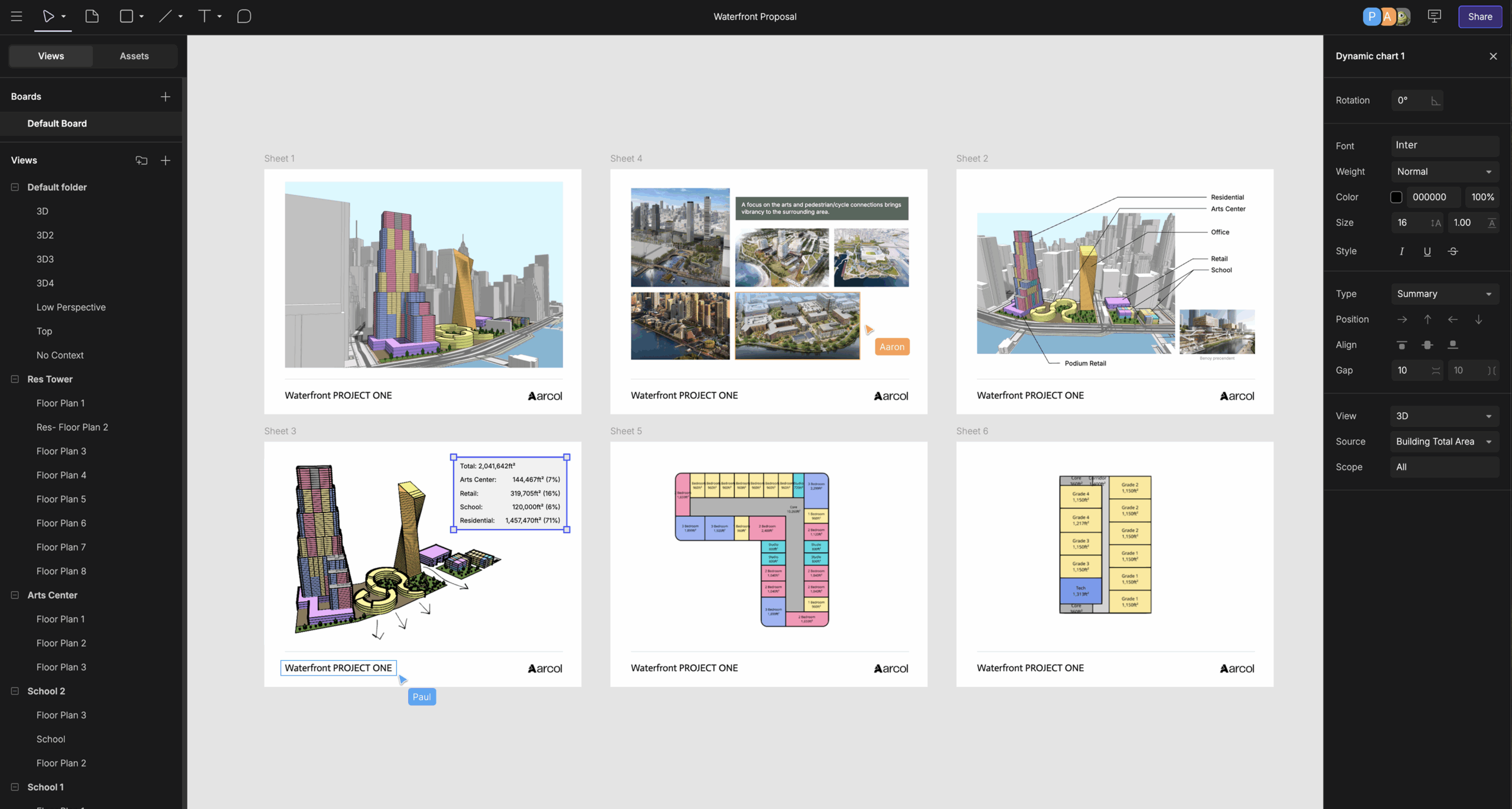 So what can it do? Arcol offers real-time collaboration (supporting multiple users and commenting), geometric modeling tools (with familiar sketch and extrude operations), automatic data calculations (live updates of square footage, unit counts, parking, costs, etc.), and a presentation workspace called Boards that synchs with everything else.