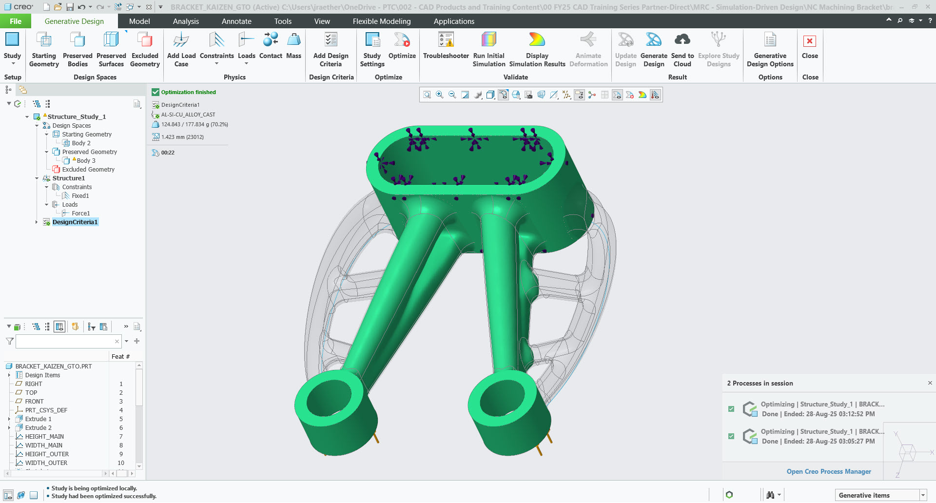 After GTO has provided the conceptual blueprint, the engineer begins the recreation phase, using traditional Creo tools such as parametric design, surfacing, and freestyle, to create a cleaner, more manufacturable version. The generative output is not a final, manufacturable product, as it may not be suitable for die-casting or NC machining.