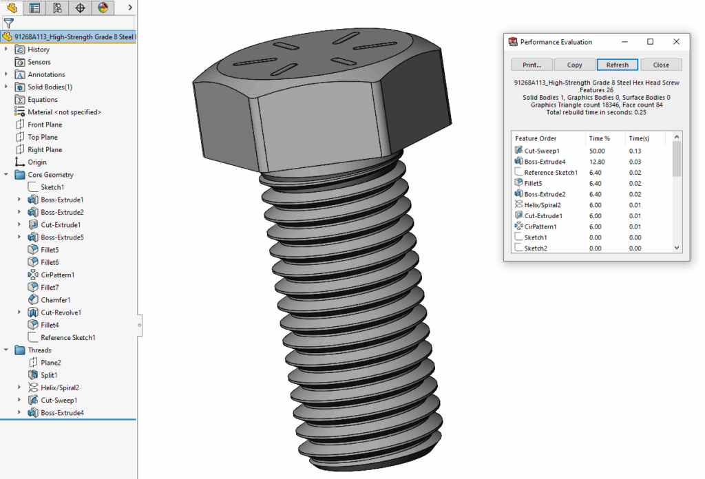 Do you want geometrically accurate helical threads modeled on all your bolts? Go ahead, but you’ll kill performance and make your colleagues want to pull their hair out. The supplier McMaster-Carr still includes helical threads in most of their models, unfortunately, and with a rebuild time to match: 0.25 seconds. Simplified models are 25 times faster.