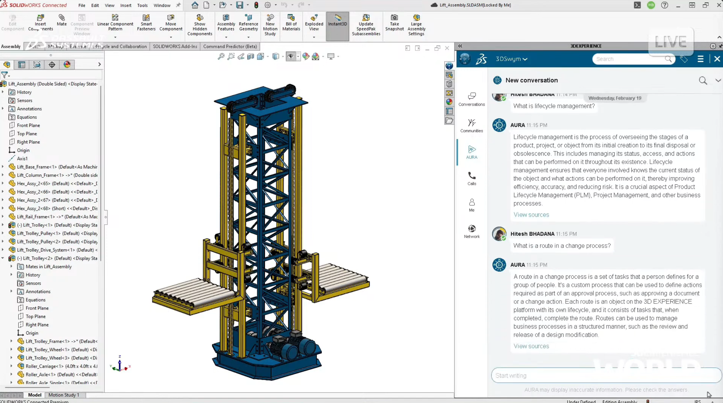 We were introduced to one of those companions: Aura, a chatbot currently available in 3DSwym, a collaboration app within 3DExperience (which itself is integrated in Solidworks, since it connects to 3DExperience). Suchit Jain, VP of strategy and business development at Dassault Systèmes, told me the company is working to integrate Aura into other parts of the platform, such as the Solidworks user forums.