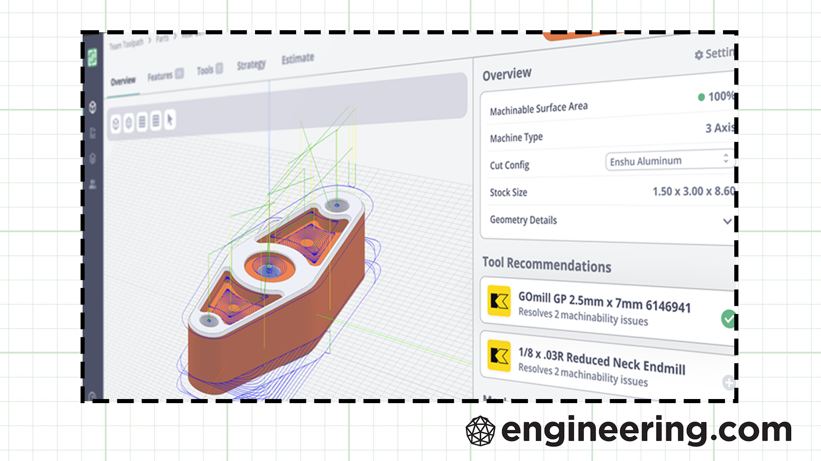 If a part can’t be machined with the user’s existing tools, Toolpath will suggest some from a database of “tens of thousands” of tools from different vendors, according to Whatmough.