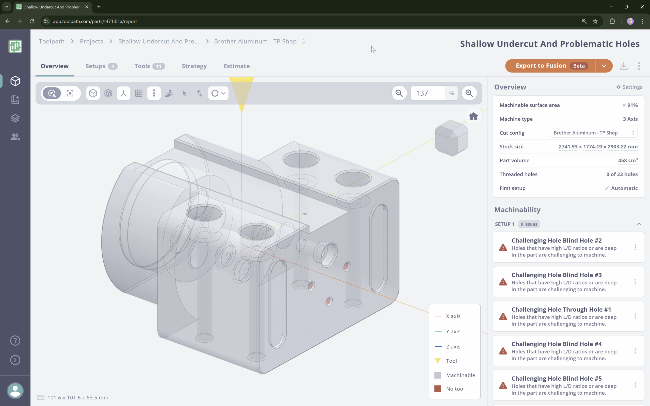A toolpath is just that, and to turn it into a real-world part you still need a CAM system to simulate it and generate the CNC machine code. Toolpath lets you send the generated toolpath directly to Autodesk Fusion, where users can take it to production in the Fusion CAM workspace. In the demo, Whatmough imported the bike clamp’s machining strategy into Fusion by copying and pasting a key into the Toolpath add-on, which recreated the setups natively in Fusion.