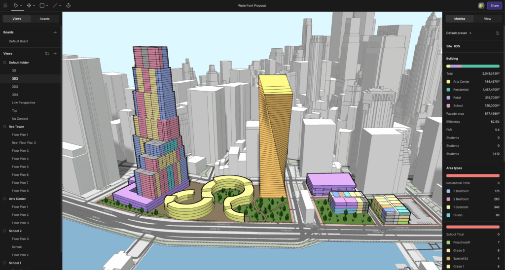 Everything about Arcol reminds me of Motif, another web-based BIM platform that launched in March. Both platforms are taking aim at what they see as the outdated BIM goliath (cough, Revit). Both are explicitly taking cues from Figma and similar web-based tools. Both are coming out of the gate with a focus on conceptual design and real-time collaboration. Both have a synchronized presentation workspace (Motif’s is called Frames). Both have an add-on to send data directly to Revit (though Motif’s is bidirectional, while Arcol’s appears to be one-way). Both are planning more BIM add-ons soon (Motif currently supports Rhino as well as Revit).