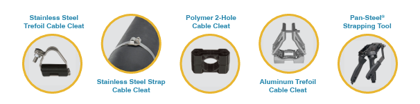 A: Cable cleats ensure that cables remain contained in the event of a short circuit fault to minimize disruption and damage to people and property. They utilize stainless steel strapping with heads or buckles, hinged designs, flame-resistant polymers, aluminum, locking nuts, and corrosion resistant hardware to fix cables onto trays and other surfaces far more securely than alternatives such as Velcro and conduit clamps. Cable cleats are available to support a variety of configurations, such as single/multicore, trefoil, and quadrafoil.Â