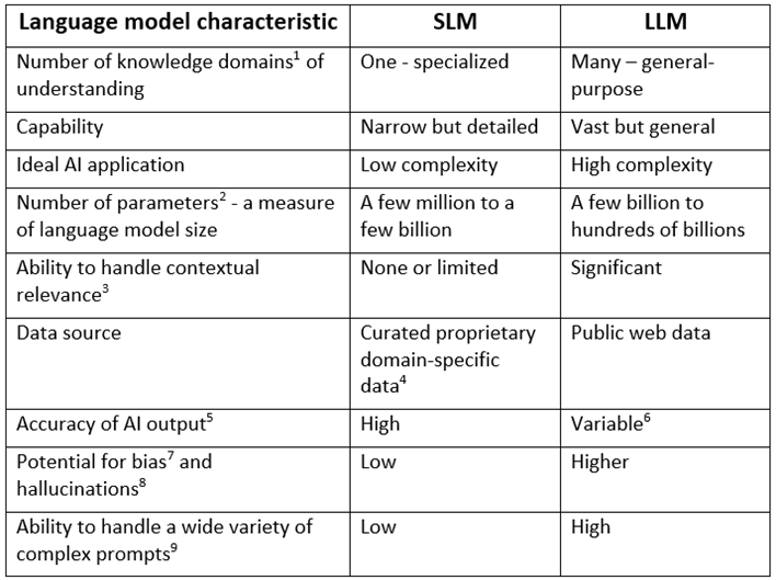 Let’s compare the characteristics of SLMs to LLMs for digital transformation projects.