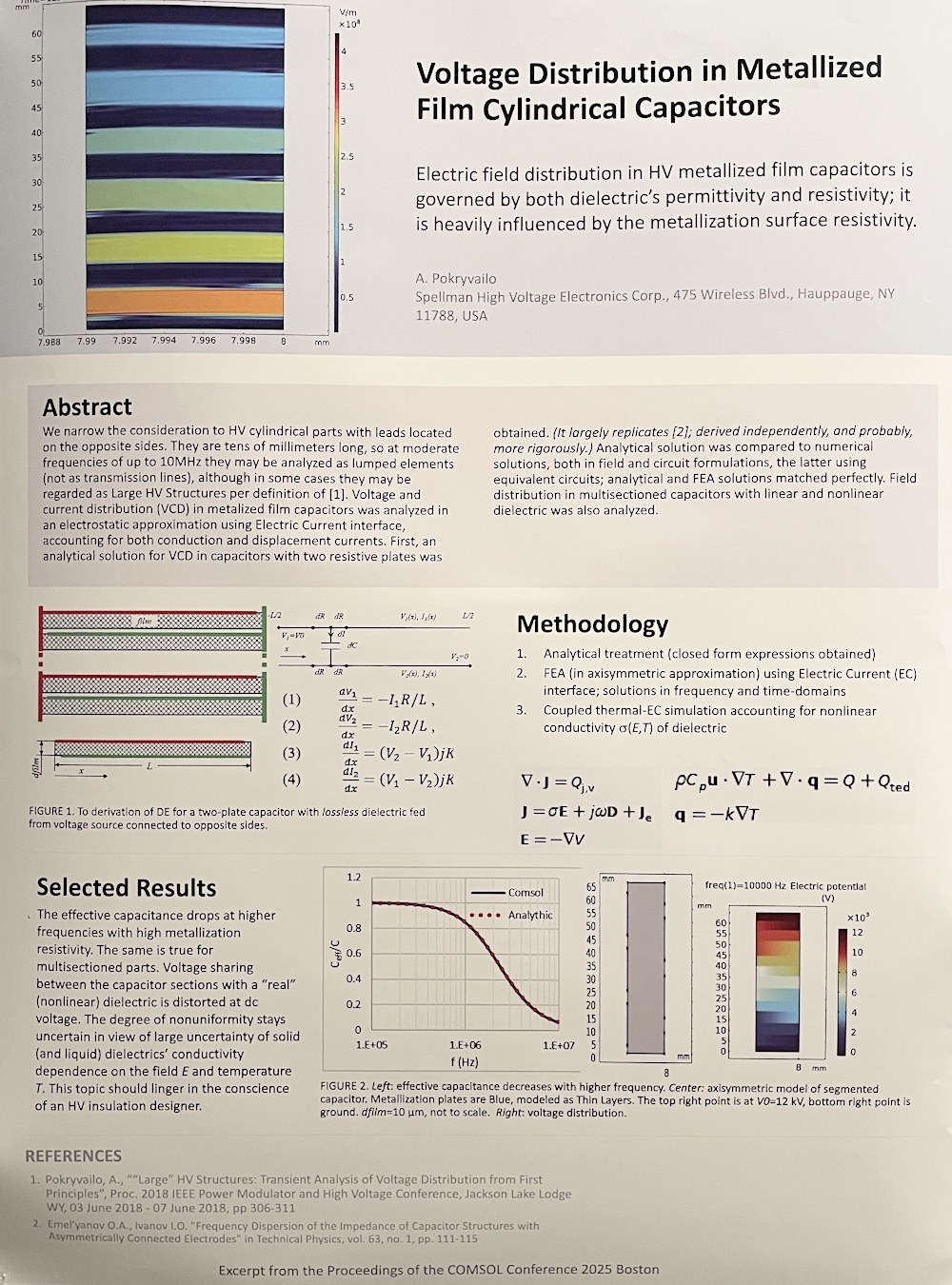Comsol announced Multiphysics 6.4 through a series of sessions, each aimed at several uses across the engineering spectrum, and thus different users. The conference included exhibits from Comsol partner companies, which provide hardware, software, and consulting that expand the software’s capabilities. Attendees could see posters of Comsol use cases that appeared at conference sessions. The poster pictured below describes “Voltage Distribution in Metallized Cylindrical Film Capacitors.”