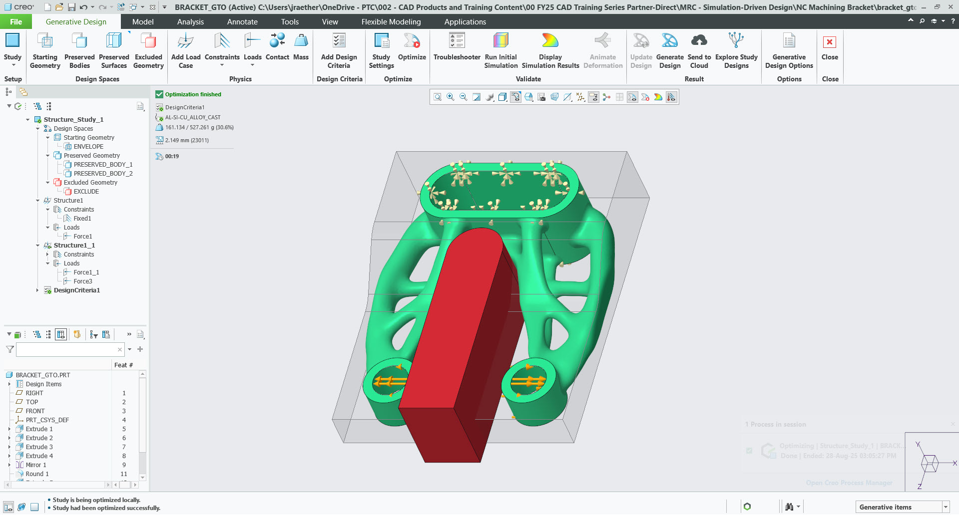 The workflow starts using Creo multibody design to create the design spaces representing the starting geometry, preserved geometry and optional exclude geometry. Once the geometry is created, the user starts the GTO application and completes the setup by designating the design spaces, defining the physics, and design criteria. The last step is to generate the design by selecting the option to optimize. The user can run as many optimizations as desired to evaluate design alternatives while changing material selection, manufacturing methods and geometric constraints.