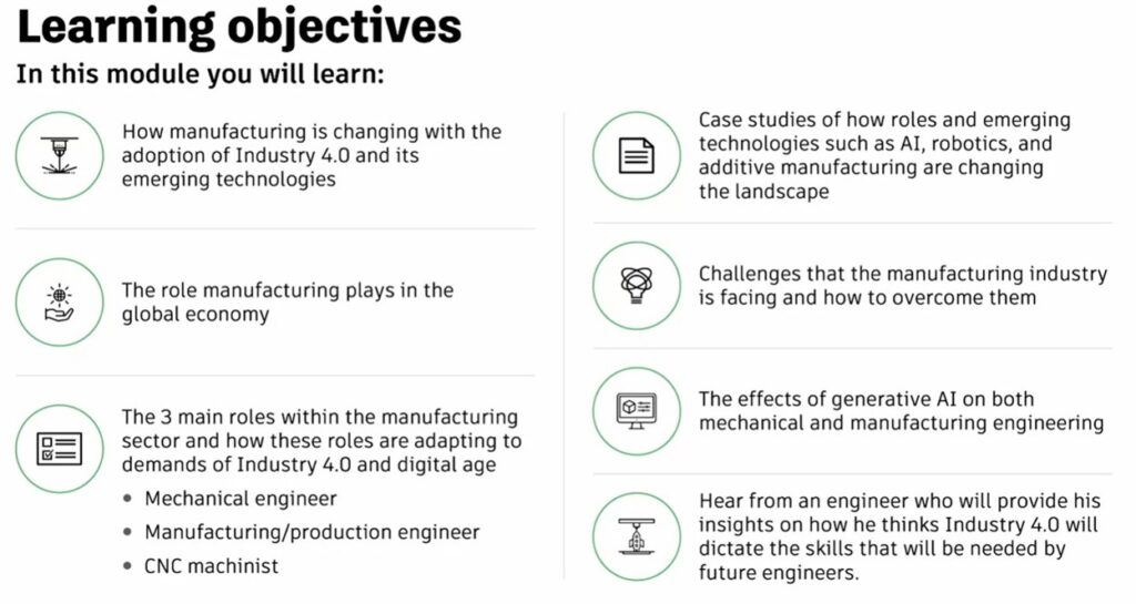 The models have a loose sequential order. For example, the course that serves as an introduction defines the term “Industry 4.0.” It also explains the driving forces behind production processes and relates the remaining challenges from Industry 3.0. A later course on digital literacy and data skills provides participants with an understanding of Industry 4.0 technologies and data measurements. This course also gives participants an understanding of the role of big data and how numerical insights drive manufacturing processes.