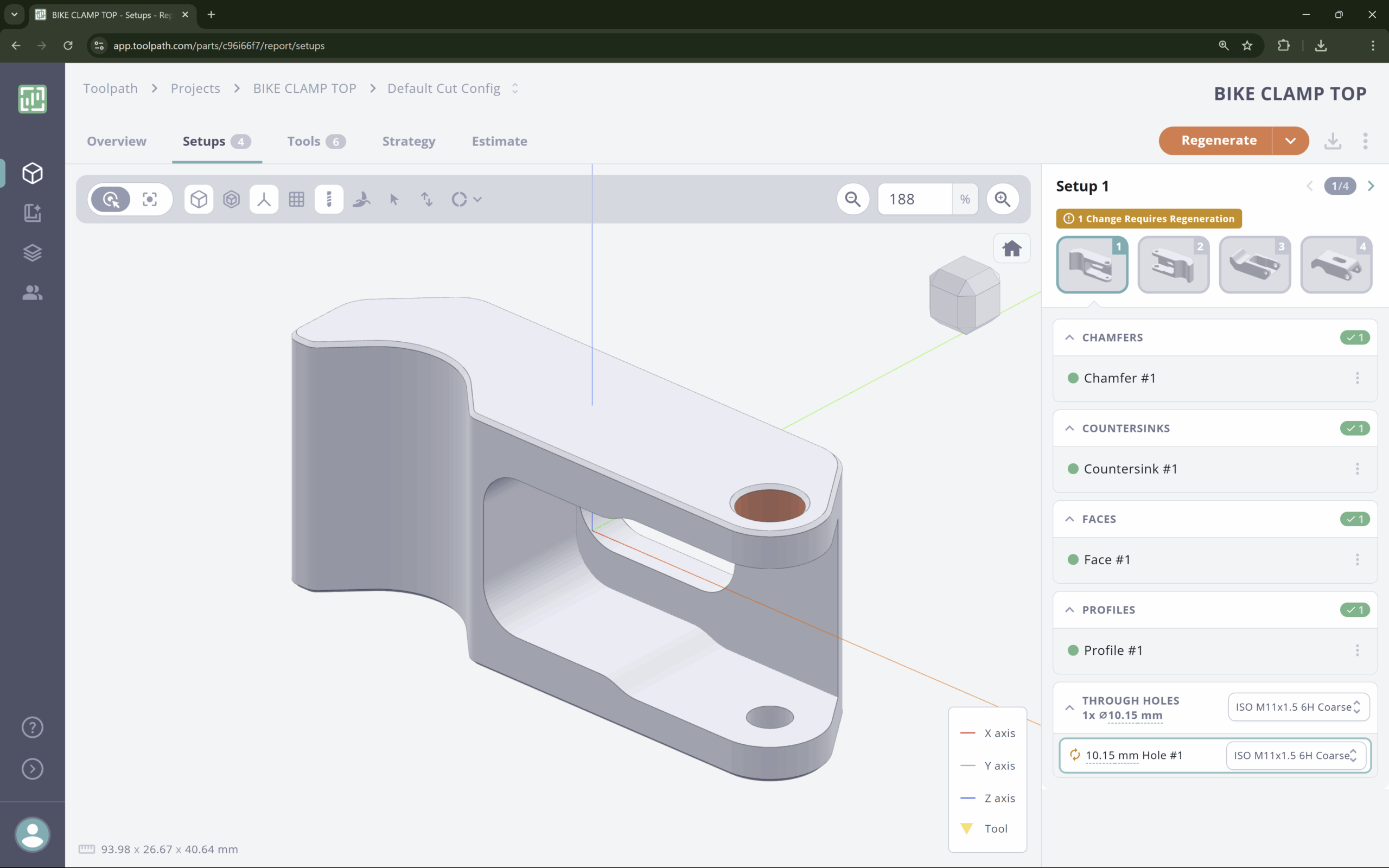 Whatmough showed me a brief demo of the AI platform in action. He pulled in a part (the bike clamp top shown above), and without doing anything else Toolpath began analyzing it. About a minute later, it had generated the full machining strategy, with four setups and six tools from Whatmough’s library, with a cost estimate of $176.95.