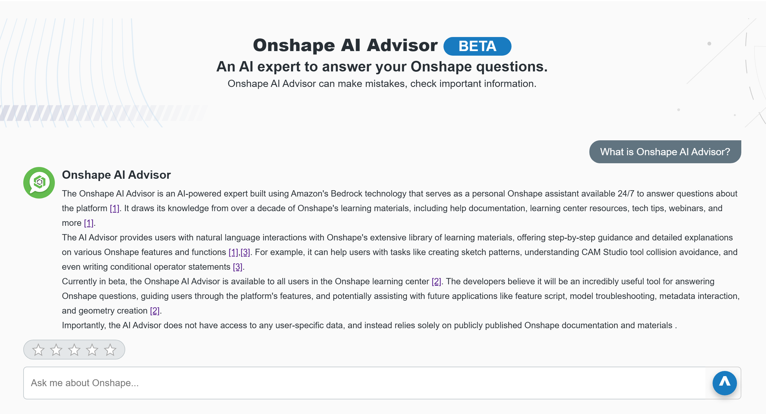 I asked AI Advisor to tell me about itself (see its response in the screenshot below). It gave an adequate description, but I wasn’t impressed with the citations. It looks like there are three of them, but they all point to the same Onshape forum post about the April 1 update that included AI Advisor.