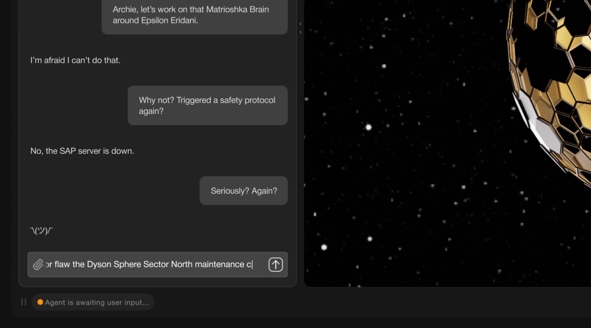 The startup takes that last claim quite seriously, as you can see in the Archie demo hype reel (their description, not mine). It’s a bizarre video that begins with an Ayn Rand quote and ends with a sassy Archie designing Dyson spheres and Matrioshka brains, star-surrounding megastructures straight out of science fiction.